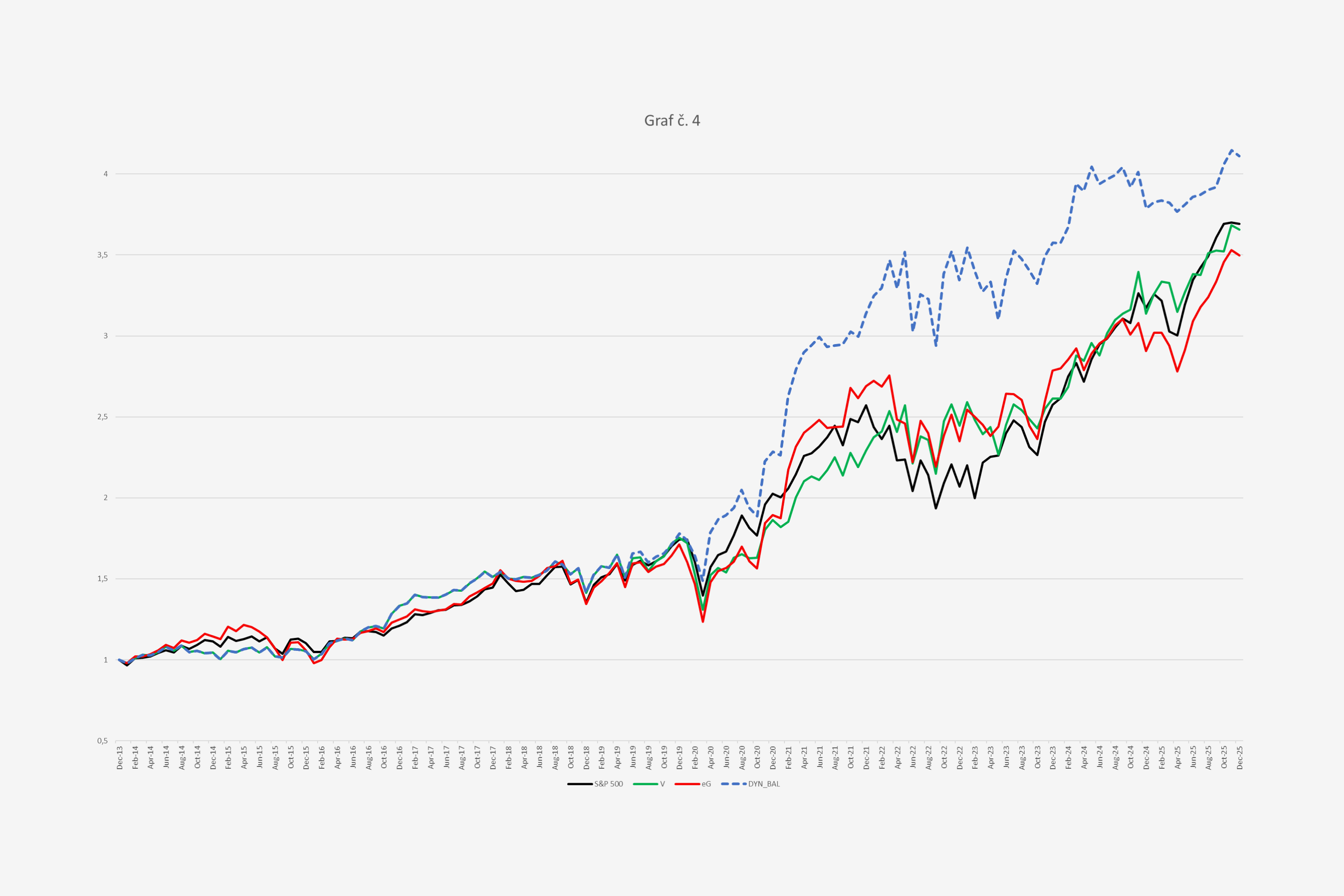 Zobrazuje výsledok snahy o lepšie diverzifikovanie kapitálu v prípade, že stratégia 4D pustí do portfólia primálo spoločností. Pôvodne sa zvyšný kapitál investoval do akciového indexu S&P 500, dá sa to však zlepšiť. Výskum ukázal, že ešte lepšie ako zvoliť stratégiu orientovanú na hodnotu (V ako value) či očakávaný rast ziskov (eG ako expected growth) je tieto stratégie striedať, na základe vopred stanoveného kritéria, ktoré zohľadňuje situáciu na trhu. Podľa toho, že stratégia dynamicky strieda a balancuje tieto dva prístupy, dostala názov DYN_BAL. Stratégia diverzifikácie kapitálu je doplnkom stratégie 4D a investuje do jednotlivých sektorov akciového trhu, nie konkrétnych spoločností. Dolár investovaný v roku 2013 do indexu mal v decembri 2025 hodnotu 3,7 dolára (ročný výnos 11,5 percenta), investícia do rastu sa zhodnotila na 3,5 dolára (ročný výnos 11 percent), investícia do hodnoty sa zhodnotila na 3,7 dolára (ročný výnos 11,5 percenta), zatiaľ čo DYN_BAL dosiahol výsledok 4,1 dolára (ročný výnos 12,5 percenta). Cieľom tejto stratégie bolo jednoduchým a efektívnym spôsobom znížiť riziko plynúce z priveľkej alokácie kapitálu do malej skupiny spoločností a zároveň prinášať podstatne vyšší výkon ako benchmark. Tento cieľ bol splnený.