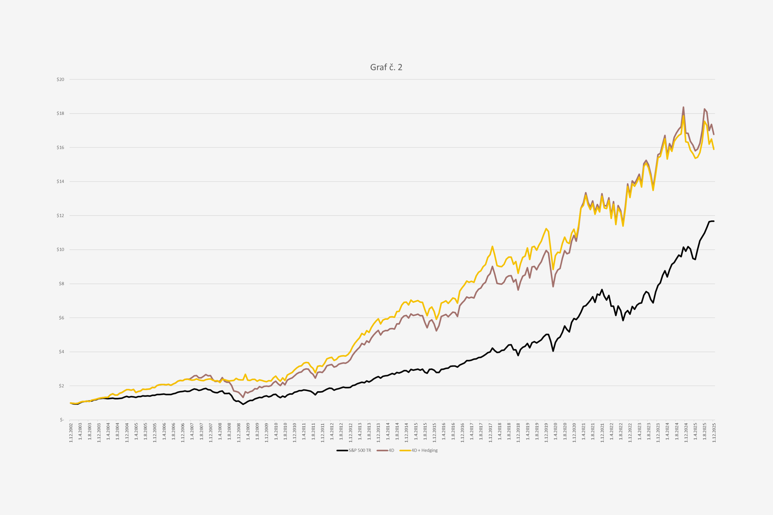 Ten istý graf, ktorý je doplnený o hedžing, ktorý sa zapína v prípade splnenia vopred stanovených kritérií. Stratégia doplnená o hedžing má takmer rovnaký výsledok ako samotná stratégia, pretože hlavným cieľom je vyhýbať sa veľkým stratám a nie zvyšovať výkon. Investovaný dolár z roku 2002 mal v decembri 2025 hodnotu 15,9 dolára, ročný výnos teda dosiahol 12,8 percenta. Napriek tomu až do pandémie ponúkala vyššie zhodnotenie, pretože počas poslednej recesie v rokoch 2008 – 2009 ušetrila kapitál, ktorý sa následne mohol viac zhodnotiť.