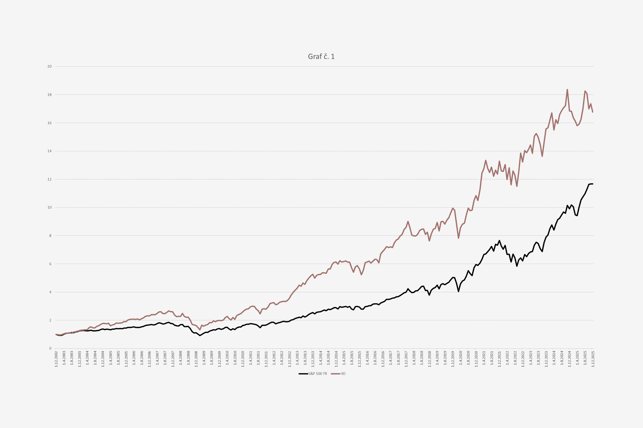 Vývoj hodnoty investovaného dolára od decembra 2002 do decembera 2025, teda v priebehu viac ako dvadsiatich rokov. Dolár mohol byť investovaný do benchmarku, s ktorým porovnávam výkon mojej stratégie. Ním je S&P 500 Total Return Index, ktorý kopíruje hodnotu 500 najväčších a najkvalitnejších amerických spoločností. Celkový výkon stratégie Four Diamonds (4D) je v sledovanom období takmer dvojnásobný oproti benchmarku. Investovaný dolár sa v prípade benchmarku zhodnotil na 11,7 dolára (ročný výnos 11,3 percenta) a v prípade investície do stratégie Four Diamonds na 16,8 dolára (ročný výnos 13,1 percenta)