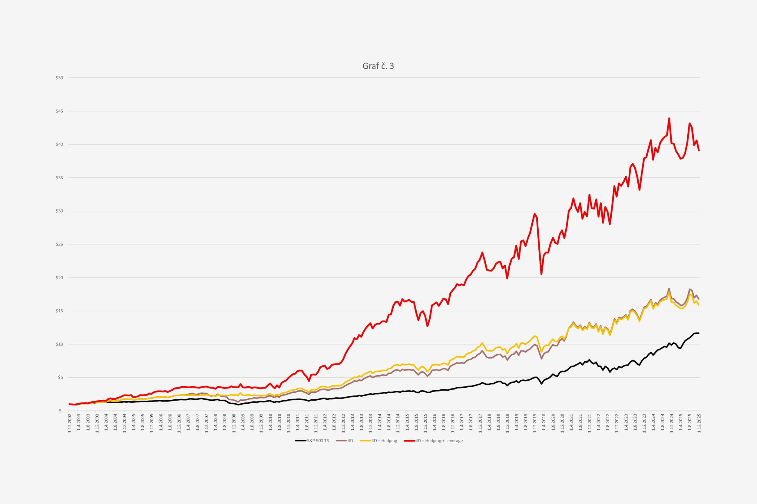 Je doplnený graf o ďalšiu krivku, k základnej stratégii a hedžingu pribudla páka (leverage). Tá sa rovnako ako hedžing zapína (resp. vypína) na základe vopred stanovených kritérií. Dolár investovaný v roku 2002 mal v v decembri 2025 hodnotu 39,1 dolára, ročný výnos teda dosiahol 17,3 percenta. Cieľom stratégie bolo od začiatku dosiahnuť aspoň dvojnásobný výkon oproti benchmarku, ideálne v pásme 15 – 20 percent. Tento cieľ bol splnený.